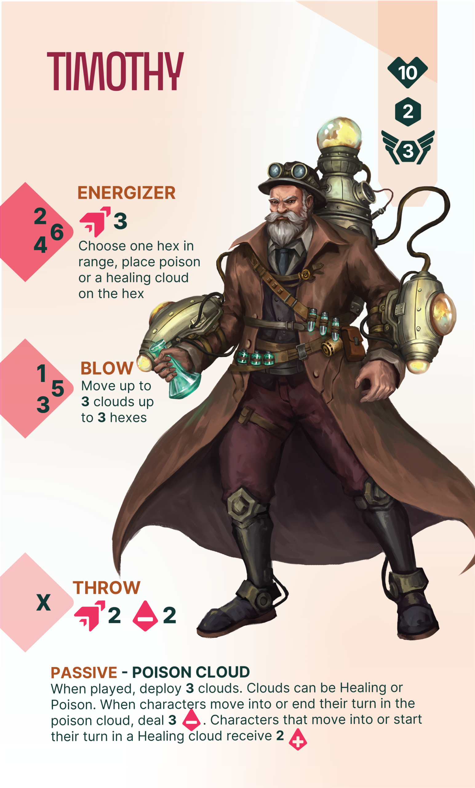 Position Timothy wisely to create dangerous poison or helpfull healing clouds while he stays out of range. Use Timothy to take control of the map.